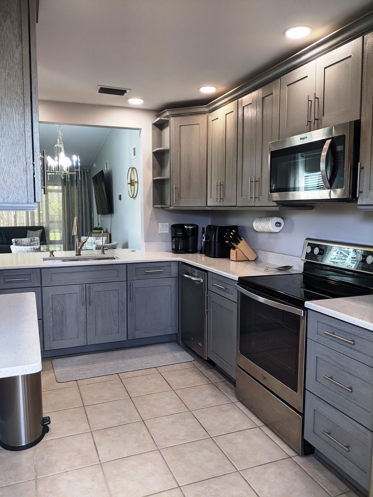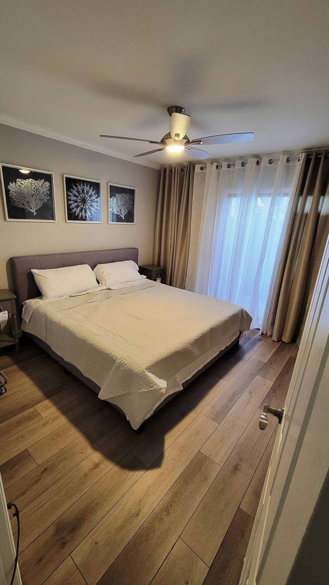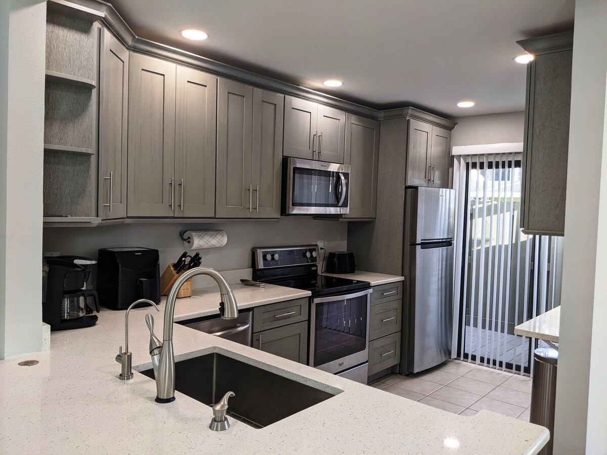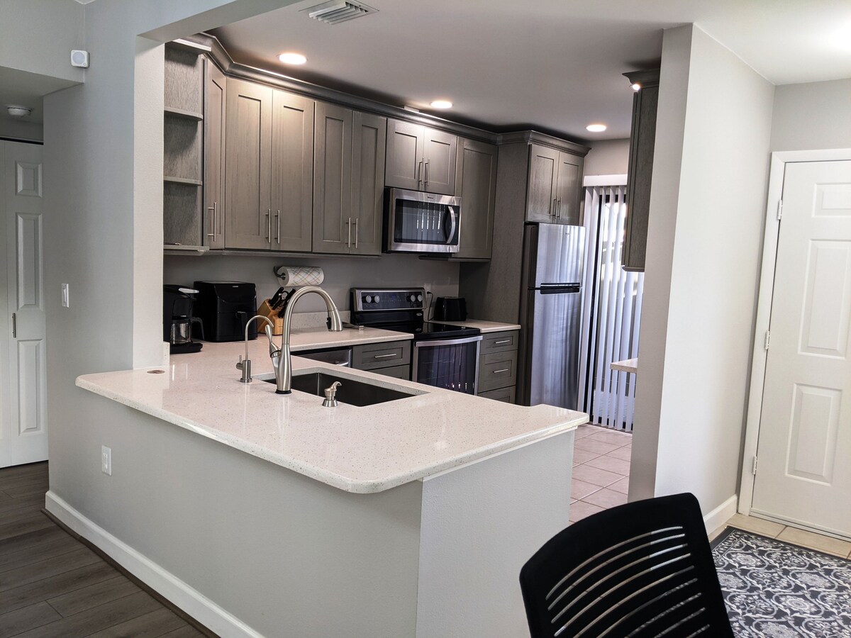 This condo has just been remodeled so you can feel very comfortable in this clean and airy space. It has brand new and beautiful kitchen cabinets with quartz countertops, a fully equipped kitchen (dishes, cups, glasses, utensils, etc.), and includes small appliances (dishwasher, mixer, air fryer, etc.), and new LVP quiet bamboo floors throughout.