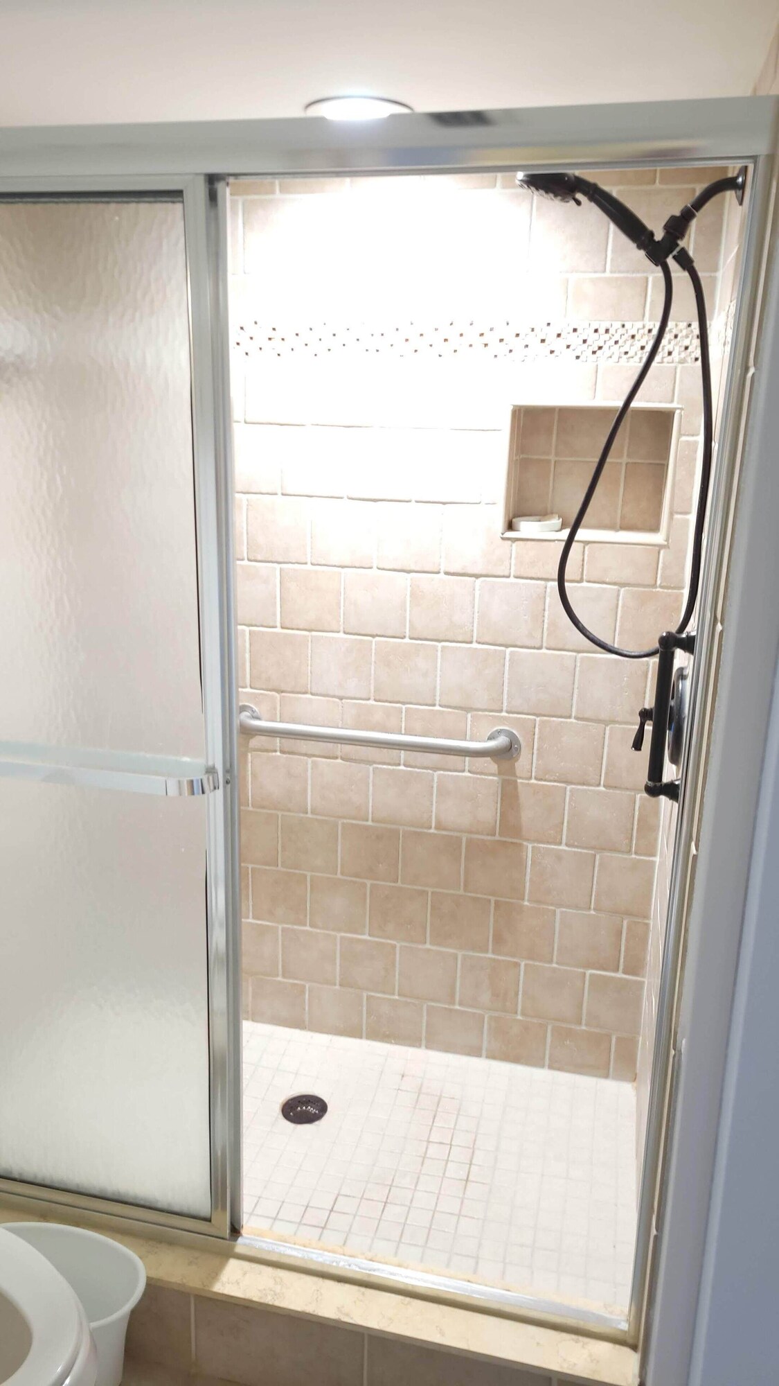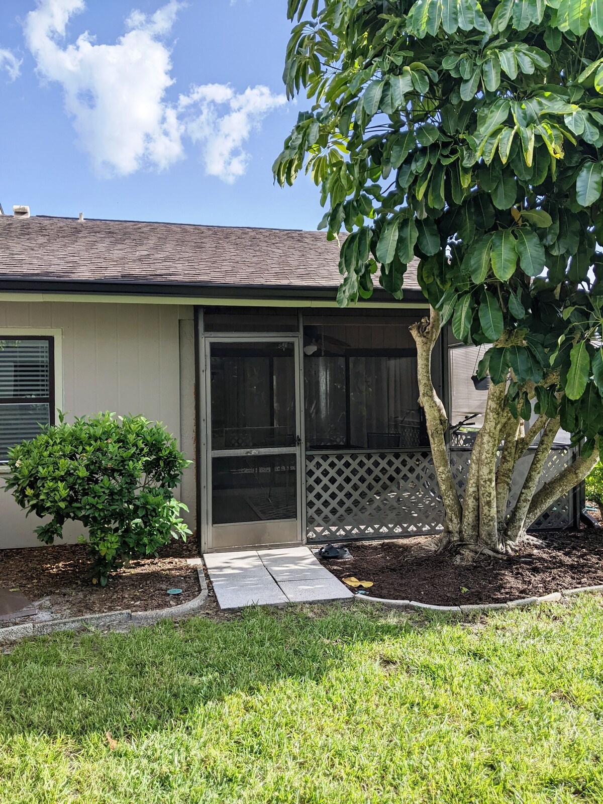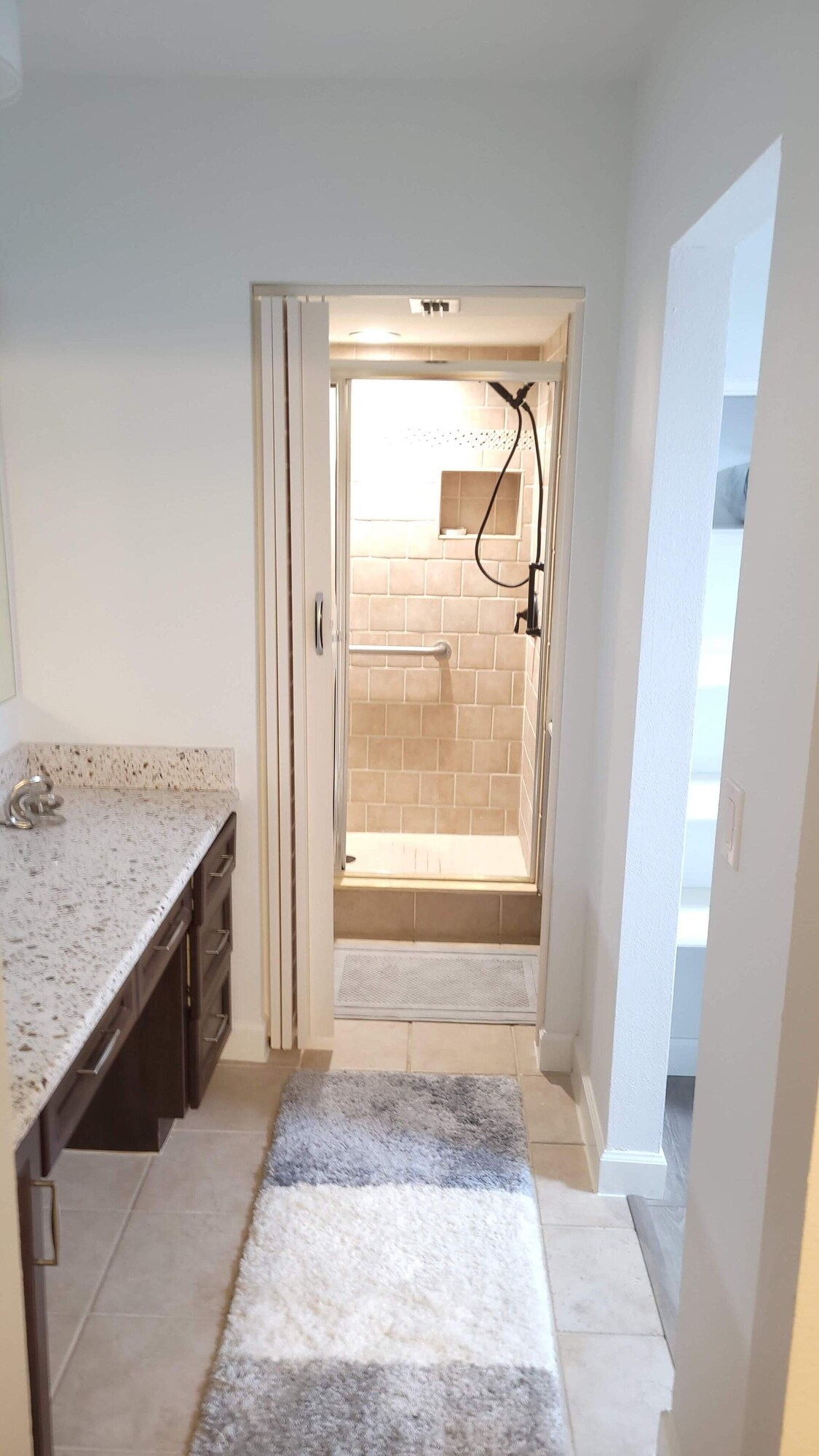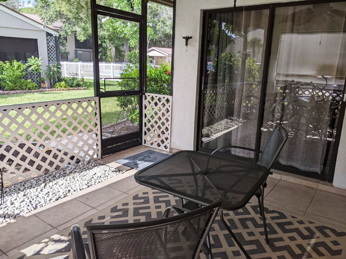 A large lanai offers plenty of space for you to relax and enjoy the beautiful trees and blue skies of Florida. There is access to the lanai from the living room and/or the primary bedroom. There is also a walk-in shower in the primary bathroom which means you don’t have to step over the tub to get in.